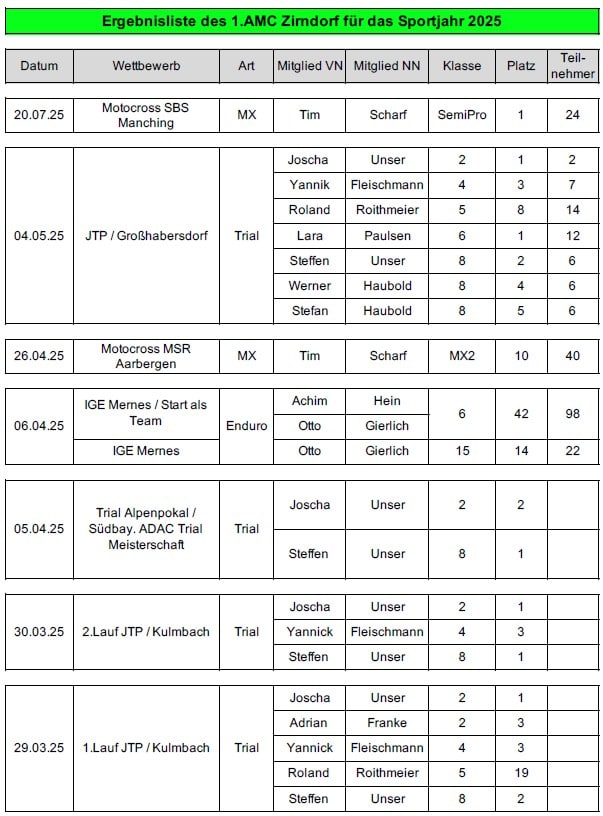 Ergebnisliste des 1.AMC Zirndorf für das Sportjahr 2025